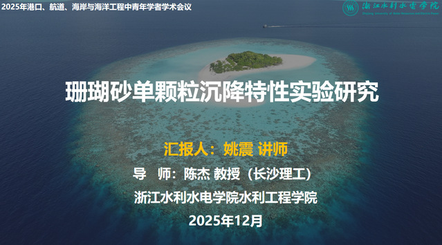 我院港航系两位青年教师代表参加了本次会议,同相关学者进行了深入的探讨与交流。其中潘昀副教授作了《波浪作用下有防波堤遮蔽的浮式光伏水动力特性及系泊方式筛选》的学术报告;姚震博士分享了《珊瑚砂单颗粒沉降特性实验研究》的相关成果,并获得了“优秀报告奖”,两位教师的报告获得了与会学者的高度评价。